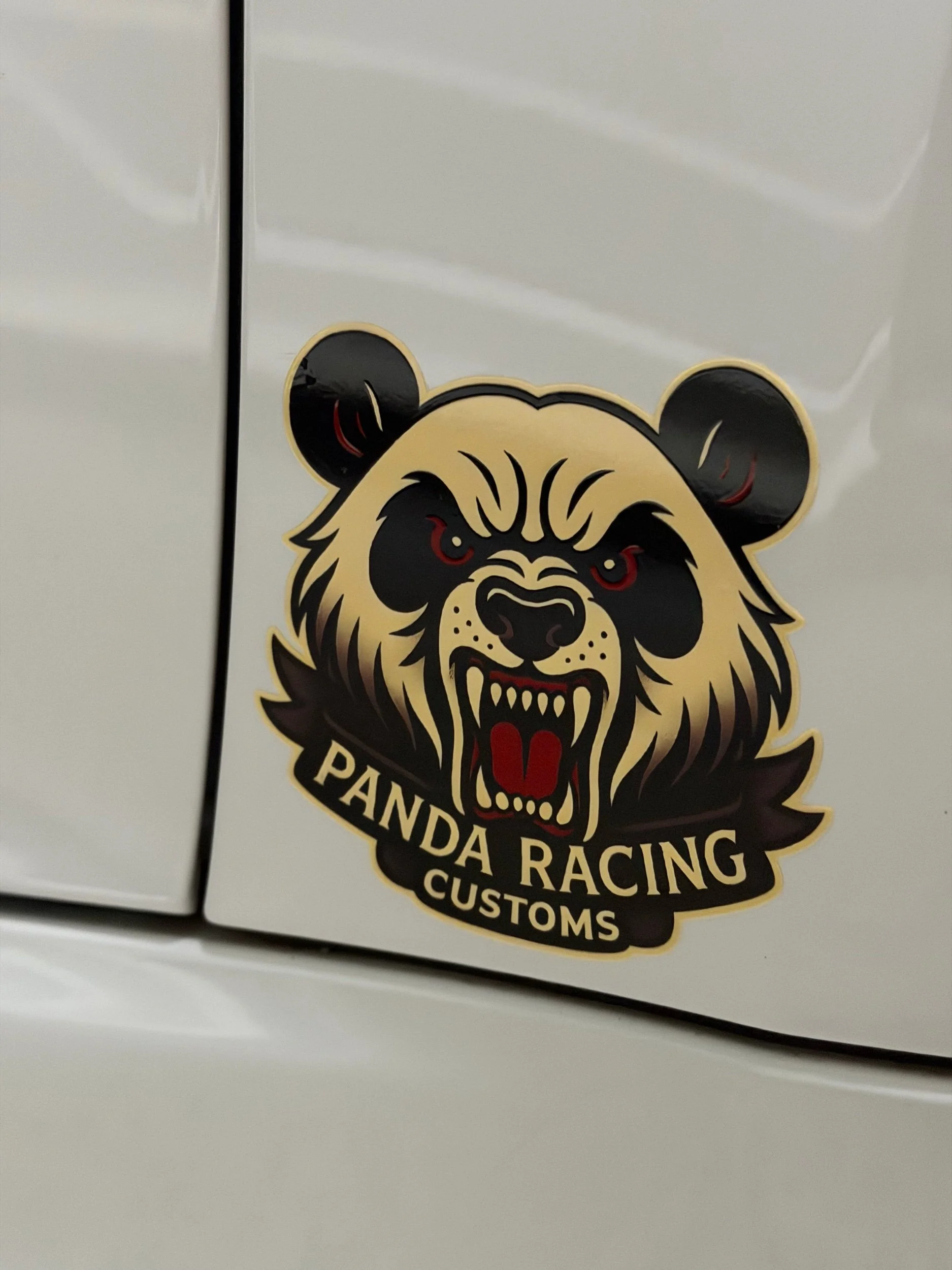 The official Panda Racing Customs American Traditional sticker. Featuring the panda logo in bold American Traditional tattoo style. With thick lines, solid colors, and tattoo inspired flair, this design hits hard on a (optional) bright yellow background that grabs attention wherever you stick it.
